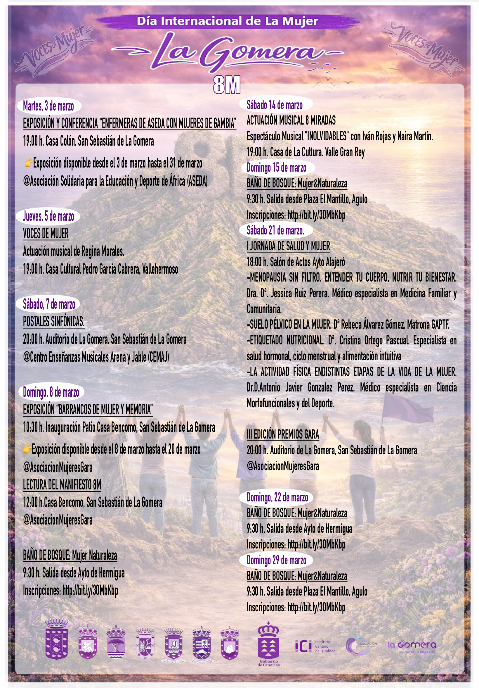 La programación continuará el sábado 14 de marzo en Valle Gran Rey, en el concierto ‘8 Miradas’, con el espectáculo musical ‘Inolvidables’ de Iván Rojas y Nayra Martín, en la Casa de la Cultura, a partir de las 19:00 horas. El domingo 15 de marzo se repetirá la experiencia de ‘Baño de Bosque: Mujer y Naturaleza’ saliendo desde la Plaza El Mantillo en Agulo, a las 09:30 horas. Las personas interesadas en participar en estas rutas de naturaleza deben realizar su inscripción a través de este enlace.