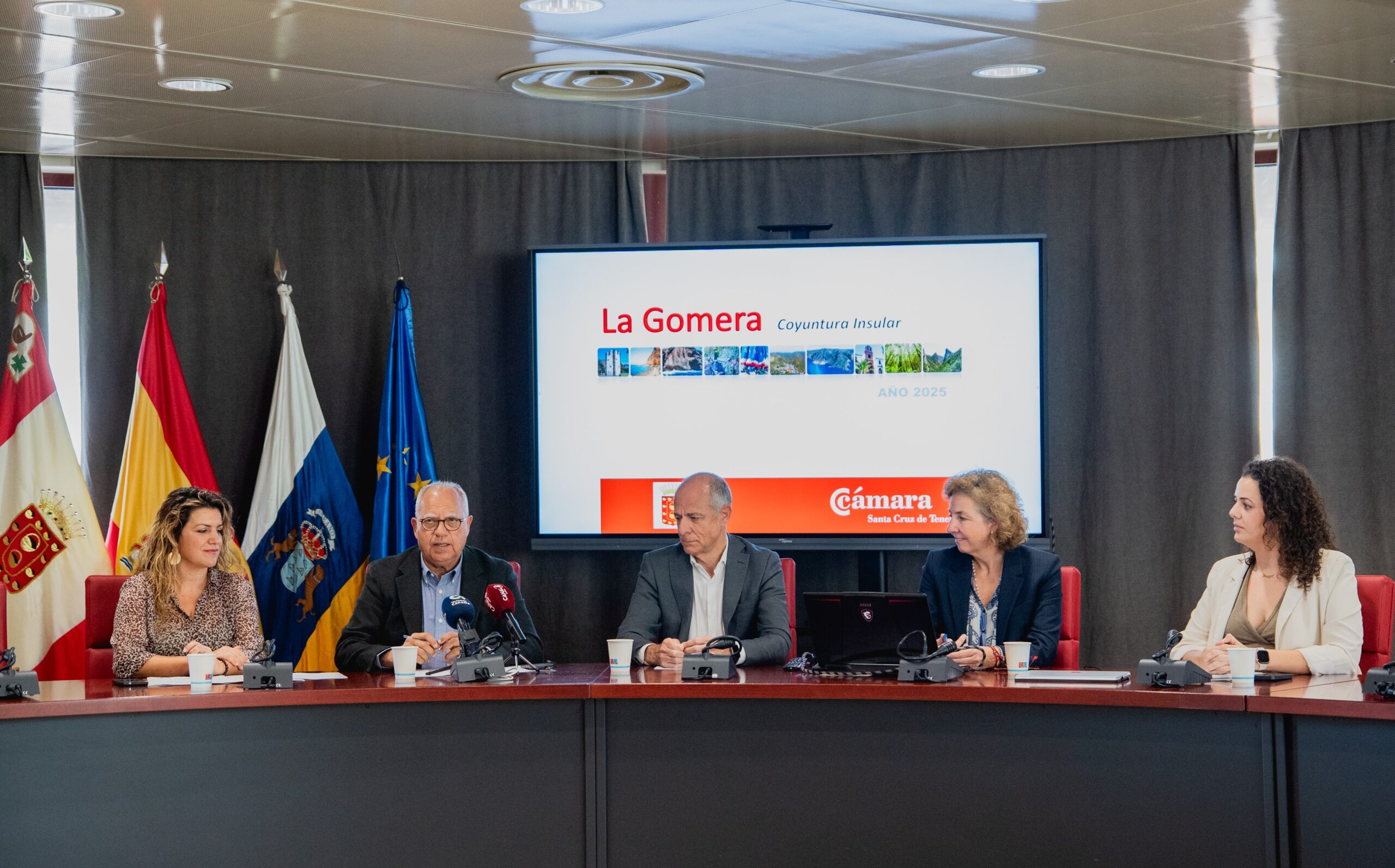 El Cabildo de La Gomera acogió este miércoles la presentación del Informe de Coyuntura Económica 2025, elaborado por la Cámara de Comercio de Santa Cruz de Tenerife, que constata la evolución positiva de la economía insular, marcada por el dinamismo del turismo y la favorable evolución del mercado laboral, tal y como expusieron durante la rueda de prensa el presidente insular, Casimiro Curbelo; el presidente de la Cámara, Santiago Sesé; la consejera de Turismo, Comercio y Consumo, María Isabel Méndez; la directora general, Lola Pérez; y la delegada en la isla, Jennifer Morales.